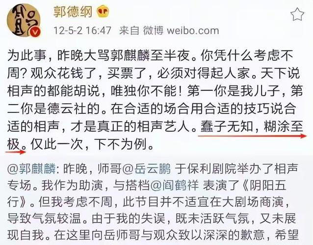 为了让父亲多看自己一眼,郭麒麟拼命表现。他考了好成绩,郭德纲只会说:“这不是应该的吗?”他帮着干家务,换来的还是冷淡。2012年,16岁的郭麒麟在岳云鹏的专场助演,选题出了点小错。结果郭德纲直接在微博上骂:“蠢子无知!”那时候的郭麒麟,难过得睡不着觉,却还是乖乖道歉。他以为父亲对自己严格,是因为他是儿子,应该比别人更优秀。